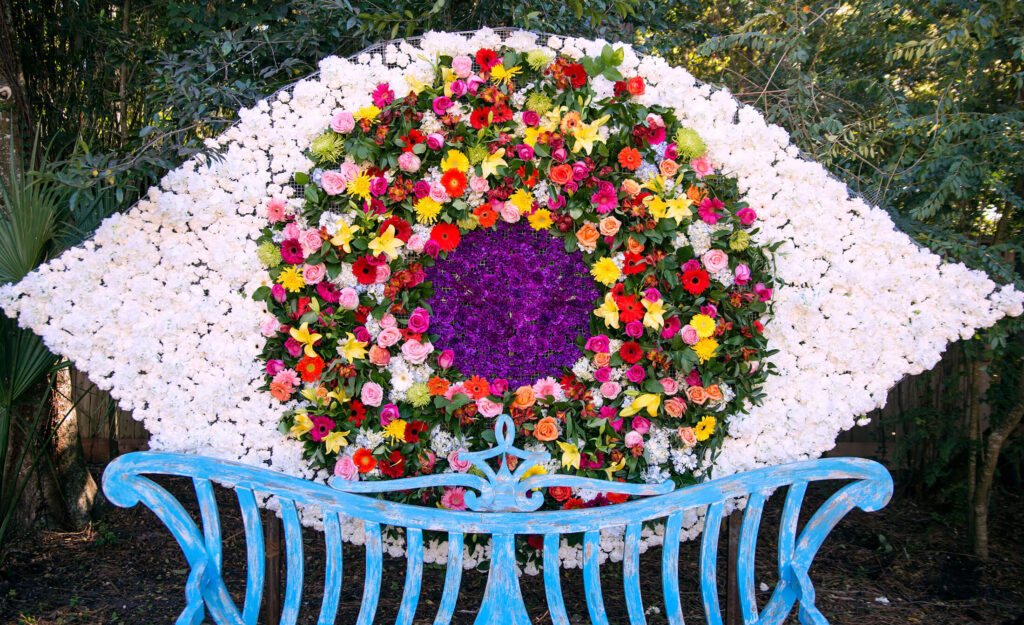 This incredible structure is custom built to house flowers in the shape of an evil eye, although you can style it with any items you like. It is covered in chicken wire for easy styling with ribbons, paper creations, moss… your imagination is the limit here.